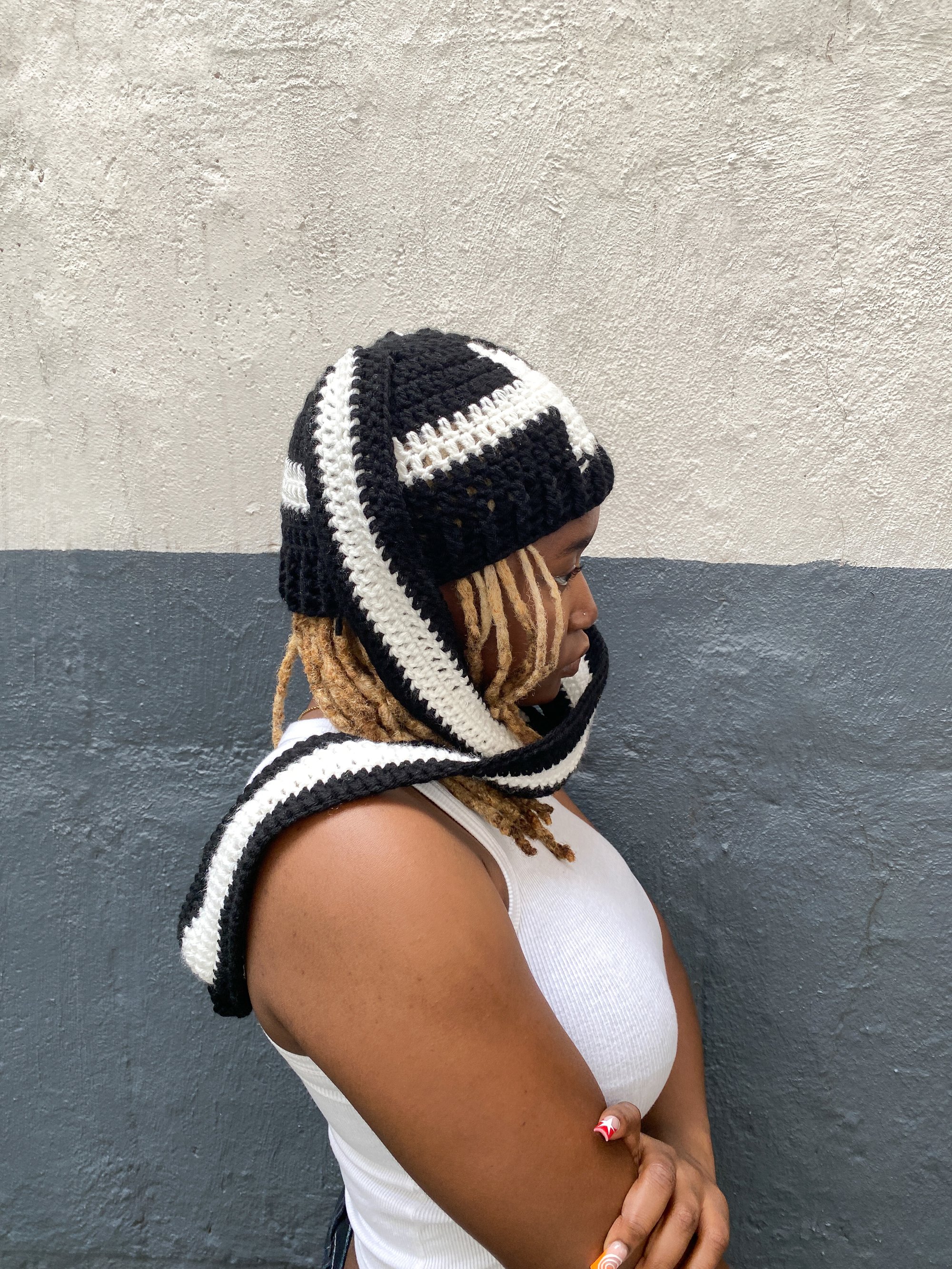 This hat doubles as a scarf, a statement piece, and a fidget toy. Comfortable and breathable fabric, good for hot days, but great for the Winter time ☆